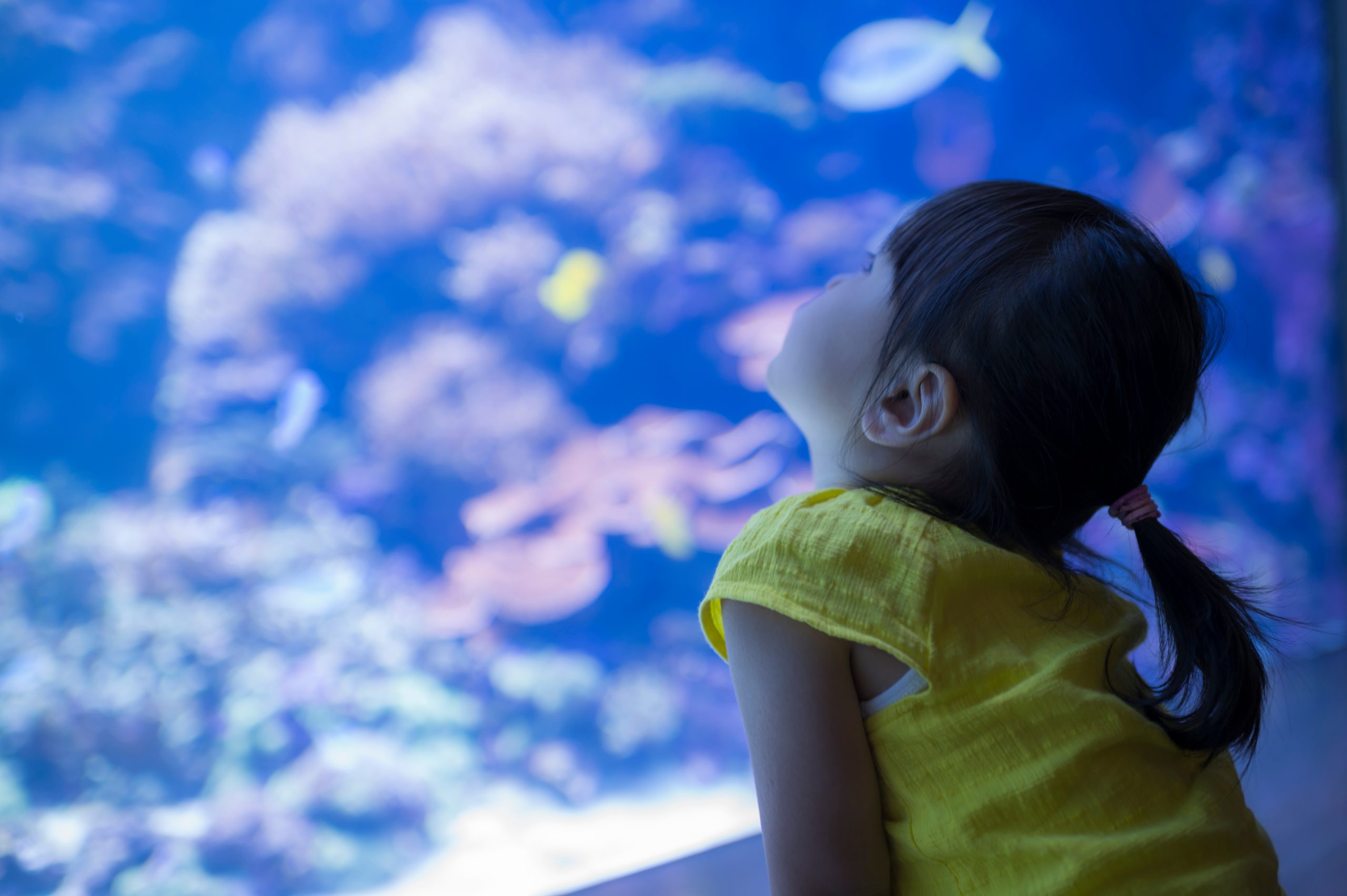 水族館の水槽で泳ぐ魚を見つめる子ども