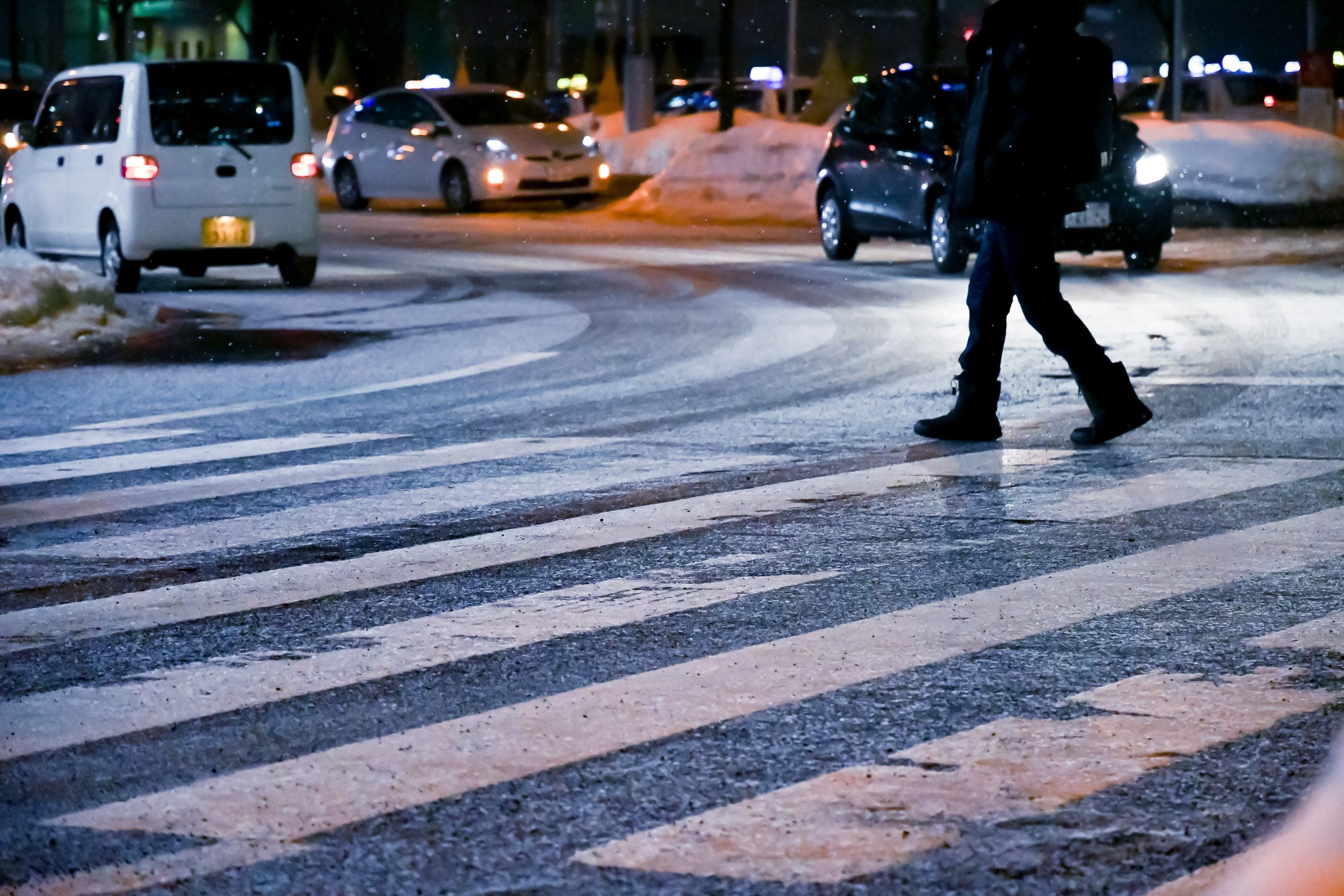 凍結路面を歩く人 / 冬の北海道 札幌市の都市風景