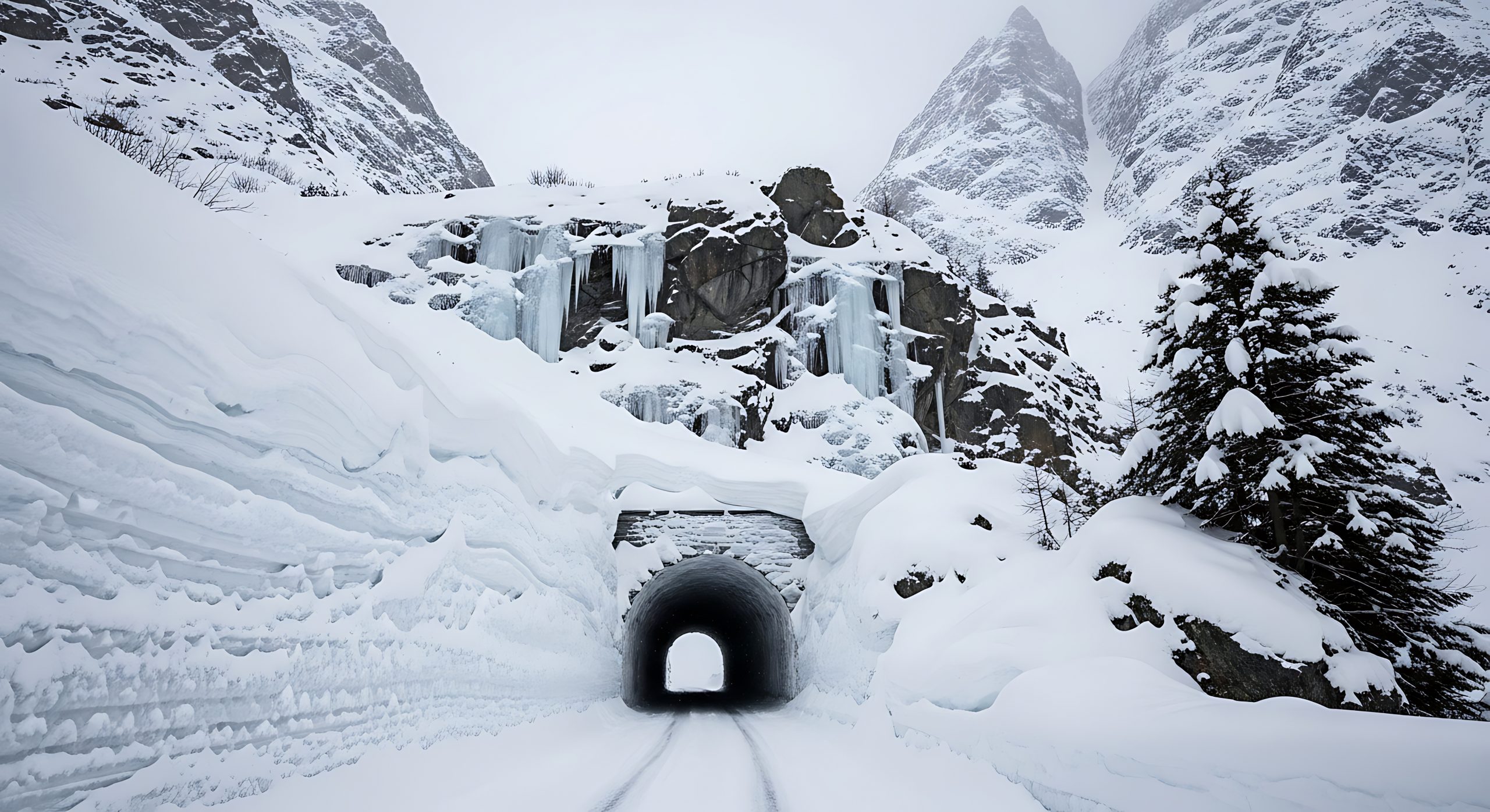 Dramatic winter landscape with snow covered mountains and a tunnel entrance