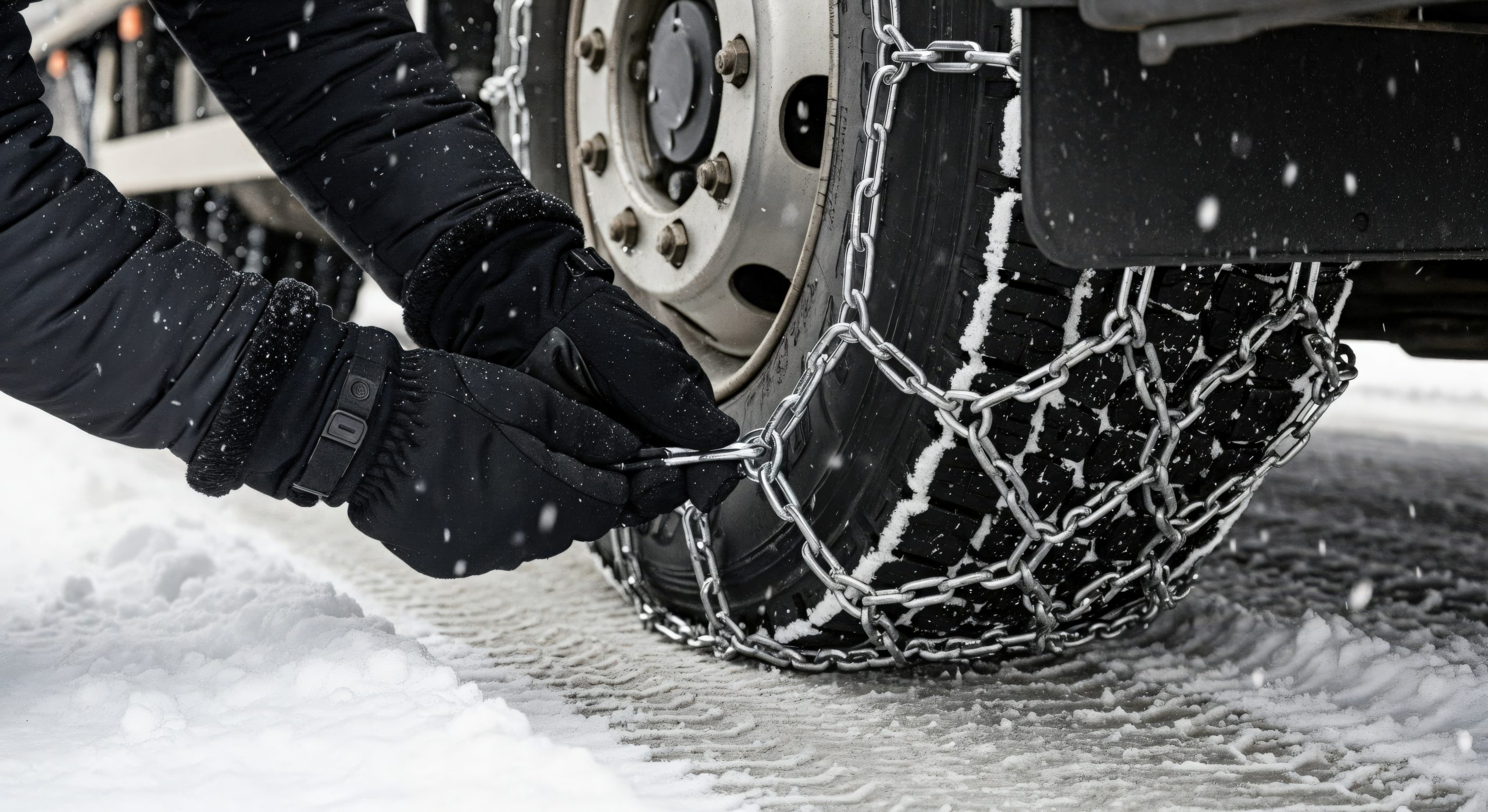 Gloved hands fitting metal snow chains onto a large vehicle tire in a snowy winter environment, ensuring traction for safe driving conditions 2025/12/10